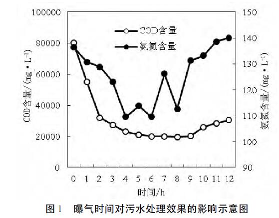 取1組6個250mL的錐形瓶,分別向其中加入100mL的待處理污水,然后向該污水中加入相當于污水體積1%的菌液,即1mL的菌液,并且對污水進行曝氣處理,曝氣量為4L/min,每隔一小時取樣記錄污水中的COD與氨氮含量,持續12h,通過觀察污水中COD與氨氮含量的變化,從而確定較佳的曝氣時間。