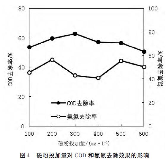 如圖4所示,磁粉的投加量為300mg·L-1時,COD的去除率達到了較高值,為62.8%,比只加入PFS和PAM時的COD去除率高10.0%,這說明加入磁粉有利于提高絮凝效果。磁粉通過吸附-電中作用,同水中的懸浮顆粒一起做為絮體形成凝結核,形成磁性絮體,由于其重力較大,沉降速率加快,提高了絮凝效果。當磁粉投入量過高時,絮凝效果下降,顯然磁粉量加入量過高,會造成磁粉吸附其他的污染物,降低了COD的去除率。如圖4所示,隨著磁粉的投加量發生變化,水體氨氮的去除率呈現一個不規則的變化,說明磁粉的投加量與廢水中氨氮的去除沒有明顯的相關性,所以磁粉的較佳投加量應該由COD的去除率所決定,確定為300mg·L-1。