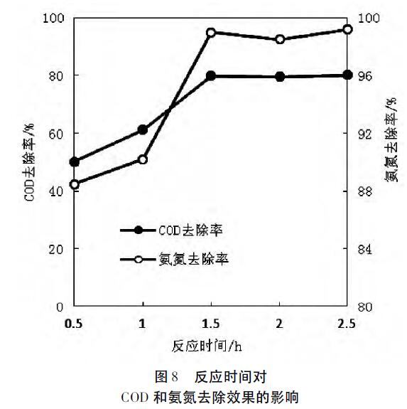如圖8所示,反應時間為1.5h時,COD的去除率達到了較高值79.9%,反應時間繼續增加時,COD的去除率變化幅度很小,基本可以忽略不計。如圖15,反應時間為1.5h以及以上時,氨氮的去除率均達到了98%以上,綜合考慮較佳反應時間為1.5h。